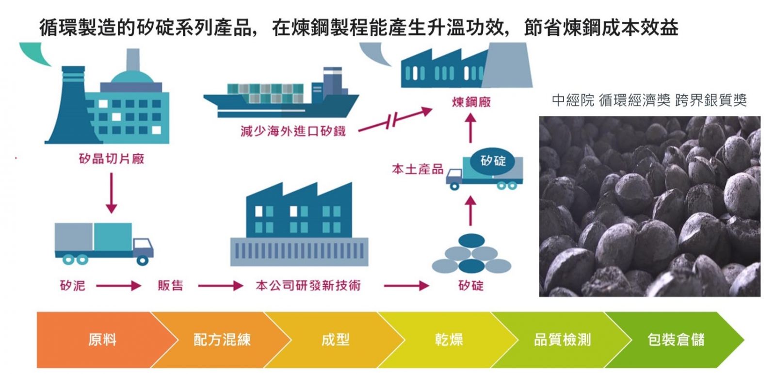 其來源為製作太陽能板過程中,產生的廢棄的汙泥。碳化矽碇主要是取代,鋼鐵產業矽鐵的資源,可減少天然礦產的開採,可以達到大量去化,而資源化的效果,可以降低矽鐵的成本跟開採。