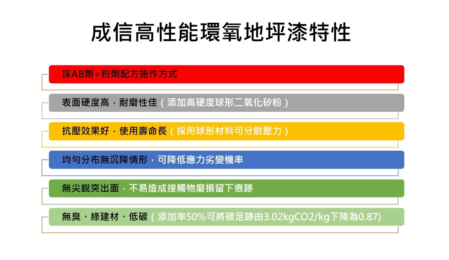 ● 無臭、綠建材、低碳(添加率50%可將碳足跡由3.02kgCO2/kg下降為1.5)。